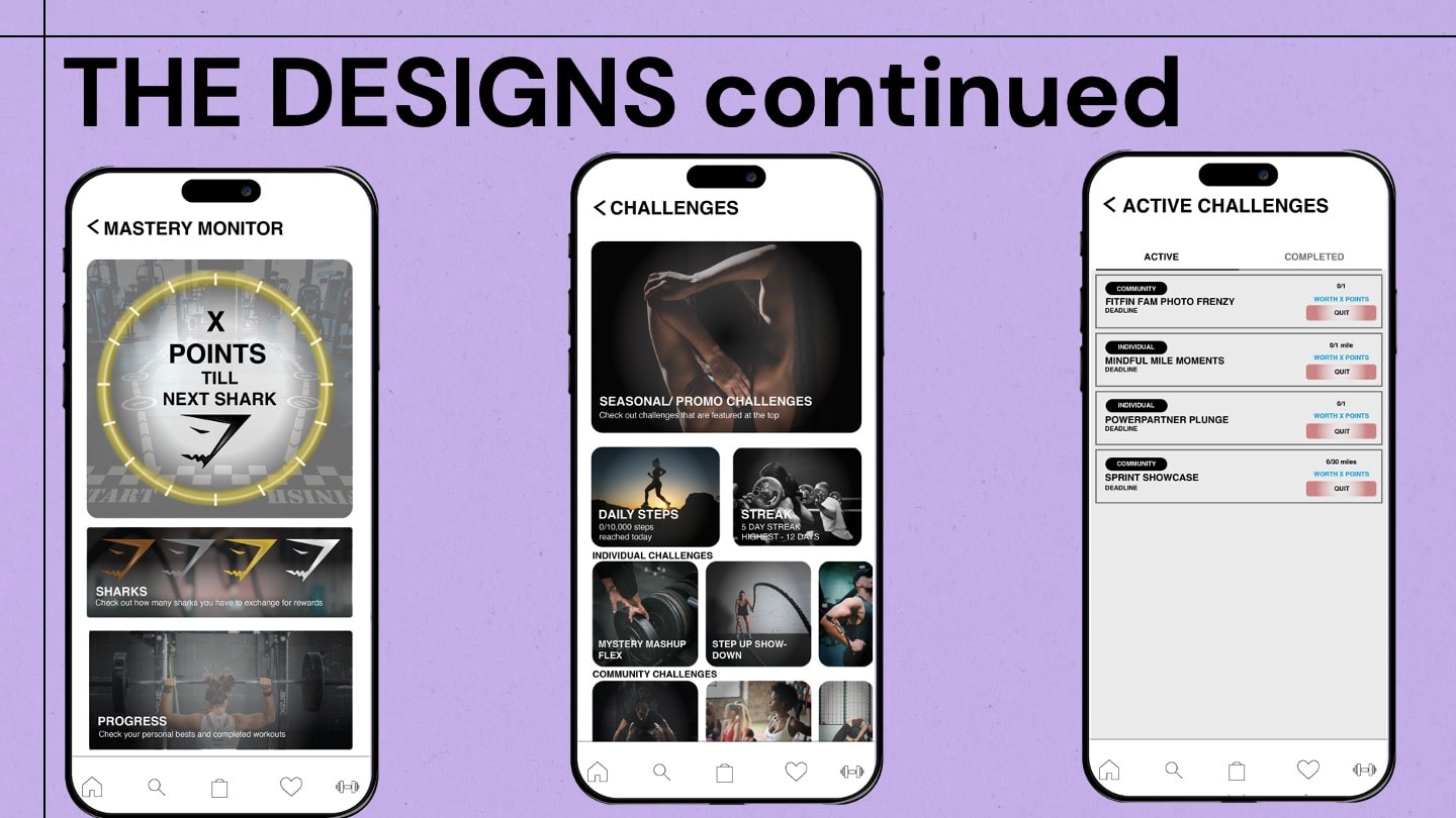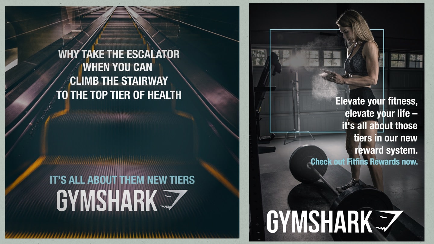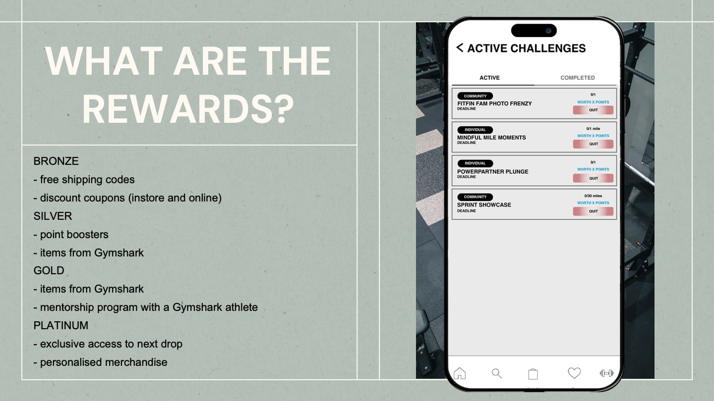 We decided to go with the idea of creating a reward system, which isn't uncommon in this day and age, as many brands do have loyalty programs. We'd have loyal customers, or as we call it, our FitFins, to join the reward system to win discounts on Gymshark products, premium exclusive access to new drops and day passes to the Regent Street Gymshark gym and many more that are tiered in categories: Bronze, Silver, Gold and Platinum. We thought this would be the most effective in seeing more Gen-Z take on healthier habits