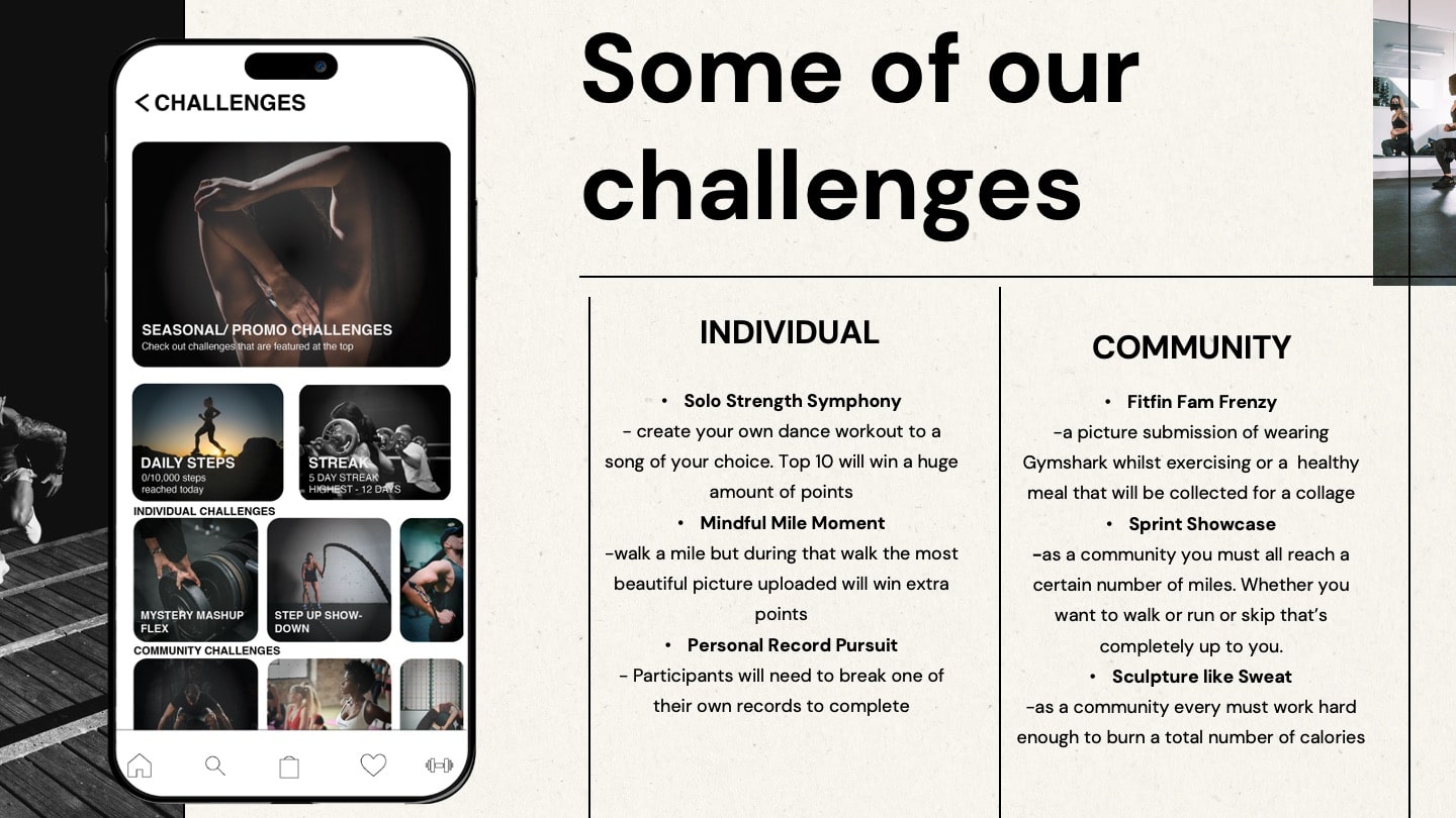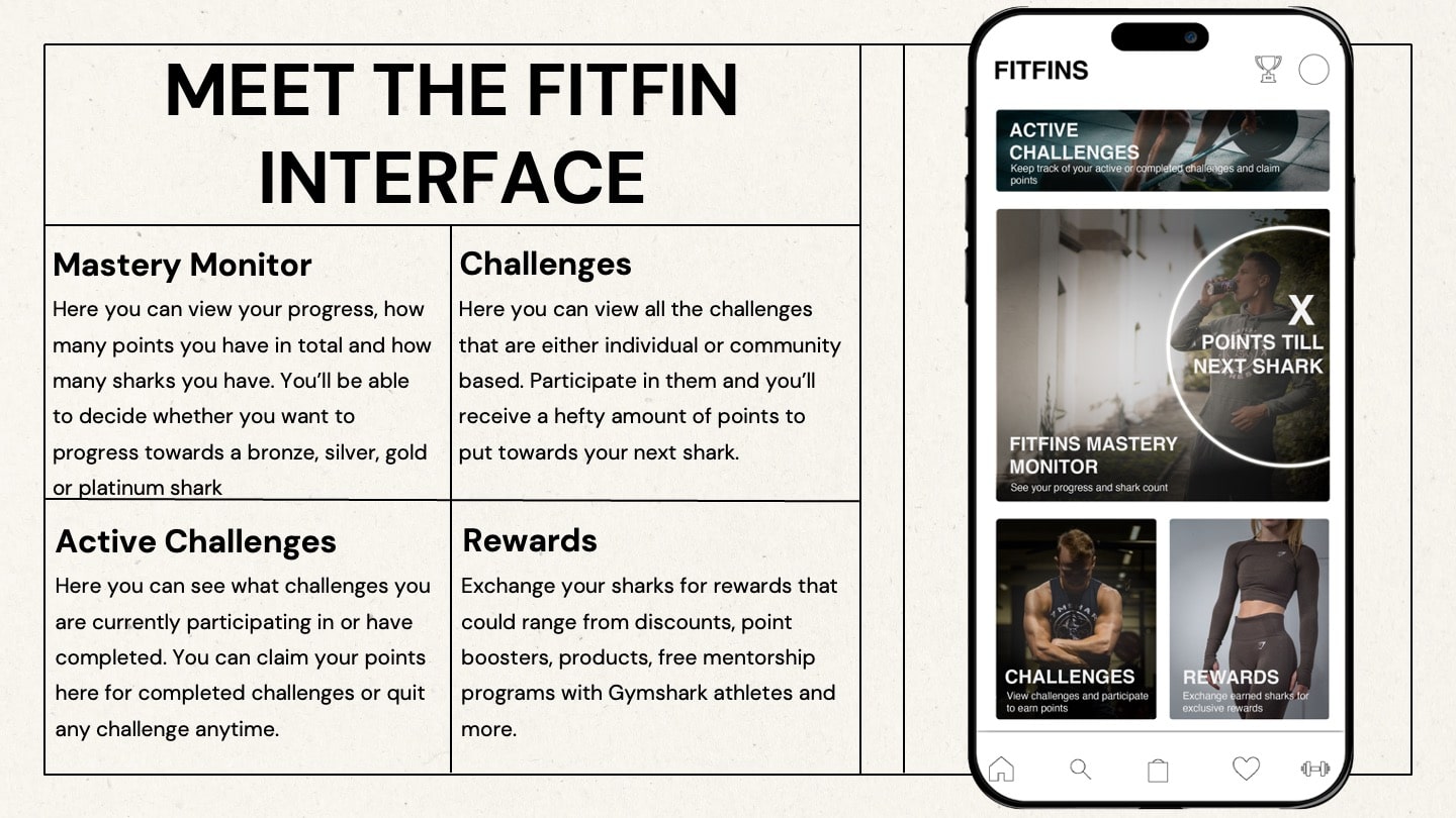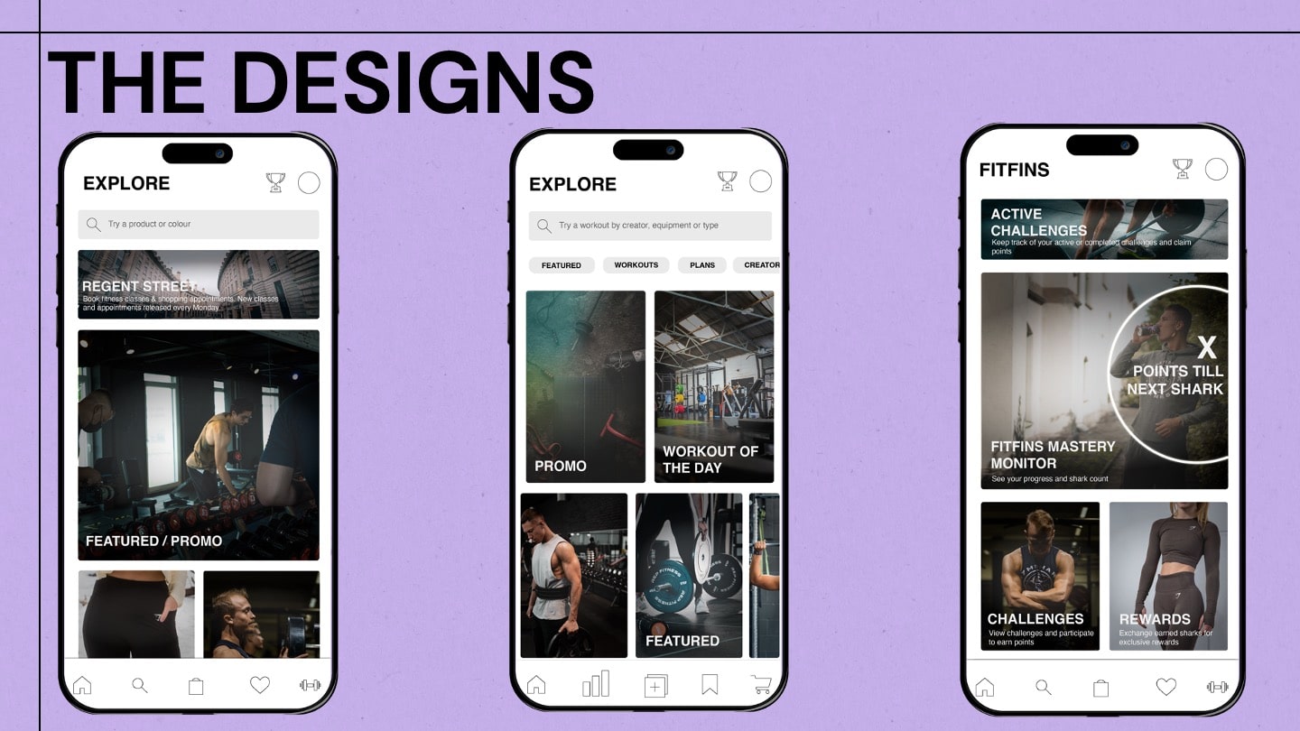 We decided to go with the idea of creating a reward system, which isn't uncommon in this day and age, as many brands do have loyalty programs. We'd have loyal customers, or as we call it, our FitFins, to join the reward system to win discounts on Gymshark products, premium exclusive access to new drops and day passes to the Regent Street Gymshark gym and many more that are tiered in categories: Bronze, Silver, Gold and Platinum. We thought this would be the most effective in seeing more Gen-Z take on healthier habits.